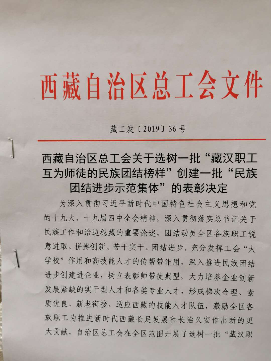 西藏自治區總工會(huì )關(guān)于選樹(shù)一批 "藏漢職工互為師徒的民族團結榜樣 "創(chuàng )建一批 "民族團結進(jìn)步示范集體 "的表彰決定