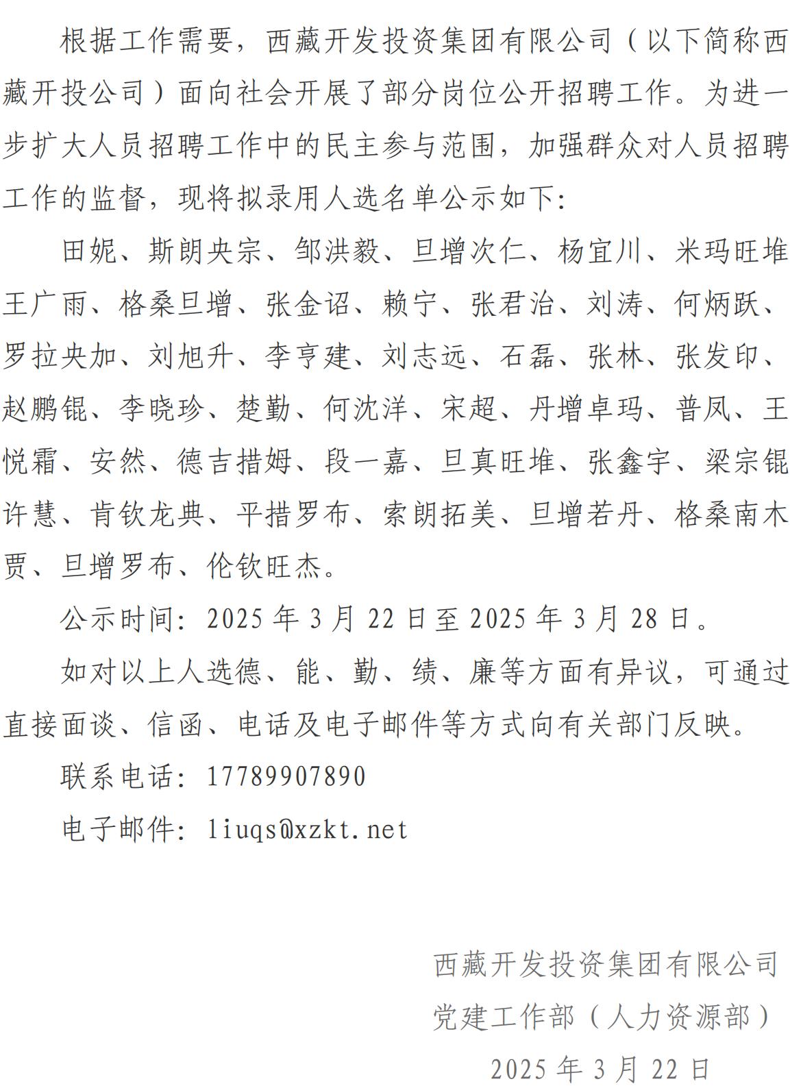 西藏開(kāi)發(fā)投資集團有限公司2024年11月社會(huì )招聘擬錄用人員公示