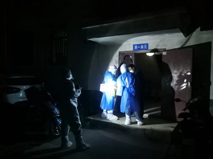 在做好防護準備后,扯起嗓門(mén)開(kāi)始耐心的給即將入睡的百姓做起動(dòng)員。在疫情期間,經(jīng)歷了漫長(cháng)的等待,蝸居在家的市民大多習慣了早晚無(wú)序的核酸檢測,但還有不少以身體不適、經(jīng)不起“磨煉”等理由進(jìn)行躲避、抗拒,隊員們不厭其煩,只能冒著(zhù)風(fēng)險逐戶(hù)登門(mén)做思想工作。舉燈踱步、排門(mén)逐戶(hù)做完檢測一眨眼三個(gè)多小時(shí)過(guò)去了,再做好試管封裝,數據統計、校對后已至子夜后半段,深秋微涼的晚風(fēng)已被隊員的熱情牢牢抵御在防護服之外。