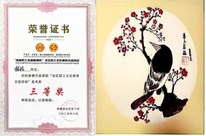 為深入學(xué)習習近平新時(shí)代中國特色社會(huì )主義思想,全面貫徹黨的二十大和二十屆二中、三中全會(huì )以及中國工會(huì )十八大精神,致敬百年工會(huì )歷程,慶祝西藏自治區成立60周年、中華全國總工會(huì )成立100周年,西藏自治區總工會(huì )于今年4月至6月在拉薩舉辦“中國夢(mèng)·勞動(dòng)美——凝心鑄魂跟黨走、團結奮斗新征程”“西藏職工互助保障杯”全區職工文化體育交流活動(dòng),并于6月27日在西藏大學(xué)文化藝術(shù)中心舉行了盛大的頒獎儀式。西藏開(kāi)投集團工會(huì )會(huì )員林玲的作品《喜上眉梢》榮獲三等獎。