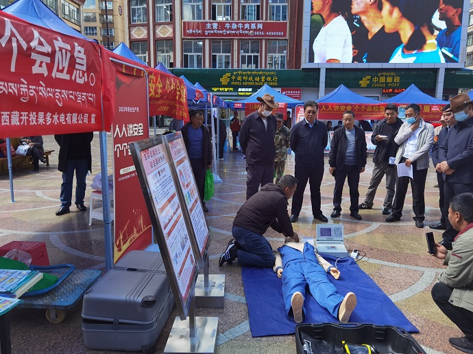 本次活動(dòng),果多水電公司向市民展示了心肺復蘇法操作演示、正壓式空氣呼吸器和安全帶等應急救援器材的正確使用方法。昌都市委常委、常務(wù)副市長(cháng)吳應海,昌都市政府副秘書(shū)長(cháng)張耀暉,昌都市應急管理局黨委書(shū)記霍映章一行到果多水電公司安全宣傳展臺參觀(guān)了心肺復蘇法演示,并對果多水電公司本次活動(dòng)給予好評。