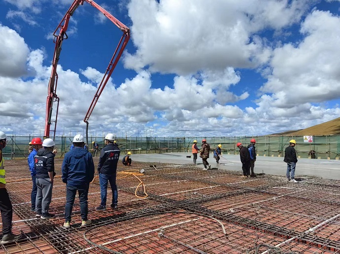 9月28日,隨著(zhù)生產(chǎn)樓屋面板最后一平方米混凝土澆筑完成,金上昌都貢覺(jué)拉妥一期700MW光伏項目生產(chǎn)樓順利封頂,項目參建單位辛苦勞作成果終于可以交上第一份答卷。