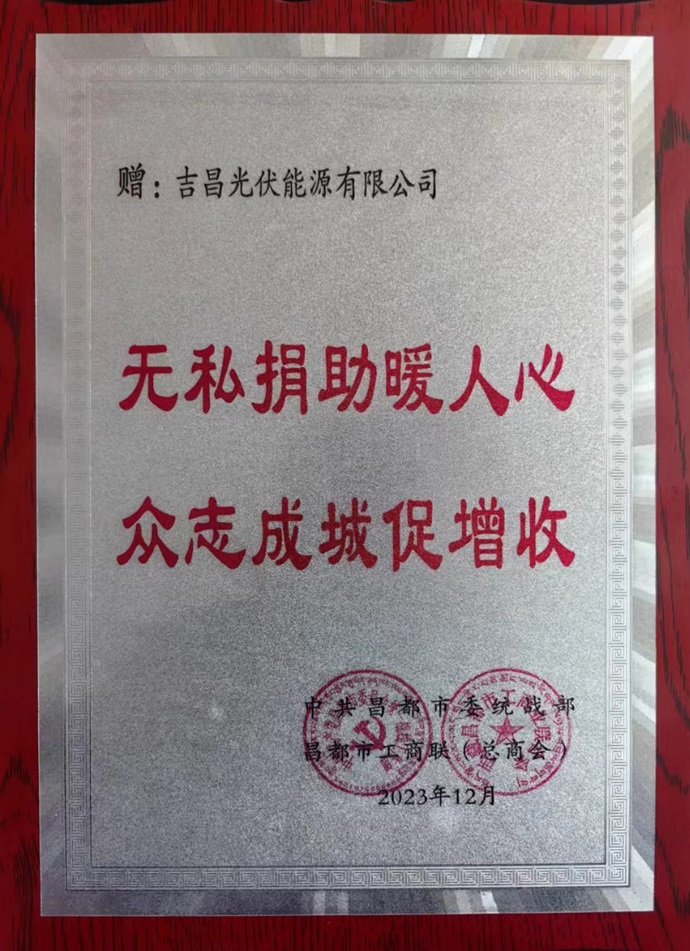 4月26日,中共昌都市委統戰部、昌都市工商聯(lián)(總商會(huì ))聯(lián)合授予西藏開(kāi)投吉昌光伏能源有限公司“無(wú)私捐助暖人心 眾志成城促增收”榮譽(yù)獎牌,對公司充分發(fā)揮典型示范帶動(dòng)效應,有效增強“萬(wàn)企興萬(wàn)村”促增收、“百企幫百戶(hù)”等活動(dòng)影響力和凝聚力,為昌都市鄉村振興貢獻企業(yè)力量予以肯定和鼓勵?!?/div>