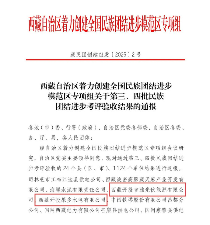 近日,西藏自治區著(zhù)力創(chuàng )建全國民族團結進(jìn)步模范區專(zhuān)項組印發(fā)《西藏自治區著(zhù)力創(chuàng )建全國民族團結進(jìn)步模范區專(zhuān)項組關(guān)于第三、四批民族團結進(jìn)步考評驗收結果的通報》,西藏開(kāi)投吉雅光伏公司、果多水電公司位列第四批考評驗收單位名單。