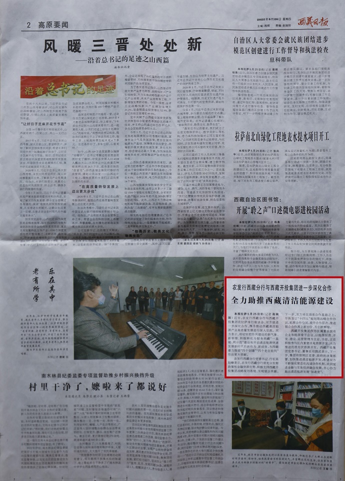 ?。ň幷甙矗段鞑厝請蟆?022年5月26日在第2版“高原要聞”欄目刊登文章,報道集團公司與農發(fā)行西藏分行銀企攜手全力助推西藏清潔能源建設。全文如下: