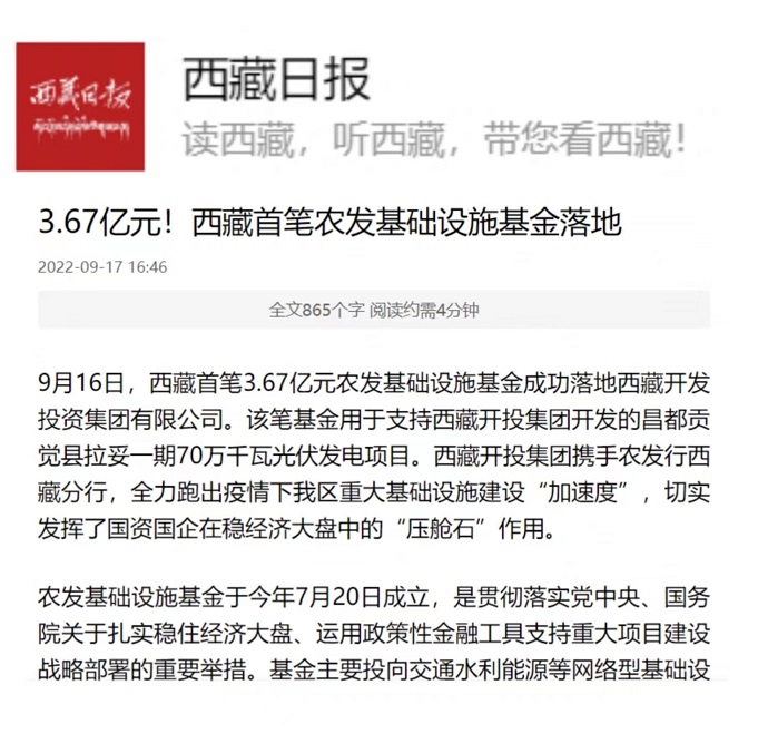 ?。ň幷甙矗段鞑厝請蟆?022年9月17日報道西藏首筆農發(fā)基礎設施基金落地西藏開(kāi)投集團。全文如下: