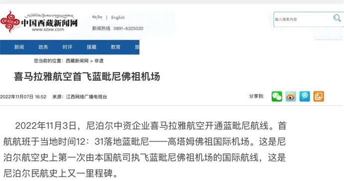 ?。ň幷甙矗?2022年11月4日至9日,中華網(wǎng)、中國網(wǎng)、中企網(wǎng)、中青網(wǎng)、中國日報網(wǎng)、光明日報、騰訊網(wǎng)、新浪網(wǎng)、搜狐網(wǎng)、今日頭條、中國旅游新聞網(wǎng)、中國西藏新聞網(wǎng)、拉薩新聞網(wǎng)、西藏生活網(wǎng)、西藏視窗、每日經(jīng)濟西藏、西藏途游網(wǎng)等媒體報道了《喜馬拉雅航空首飛藍毗尼佛祖機場(chǎng)》文章。摘要如下: