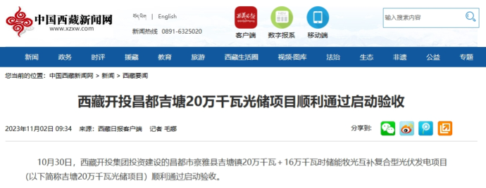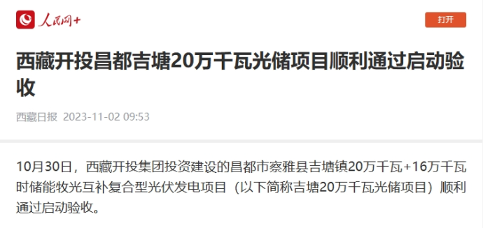 人民網(wǎng)、中國西藏新聞網(wǎng)、西藏日報客戶(hù)端報道了《西藏開(kāi)投昌都吉塘20萬(wàn)千瓦光儲項目順利通過(guò)啟動(dòng)驗收》