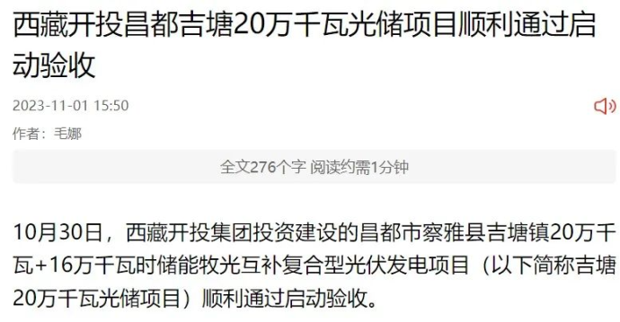 編者按:11月1-2日,人民網(wǎng)、中國西藏新聞網(wǎng)、西藏日報客戶(hù)端報道了《西藏開(kāi)投昌都吉塘20萬(wàn)千瓦光儲項目順利通過(guò)啟動(dòng)驗收》。全文如下: