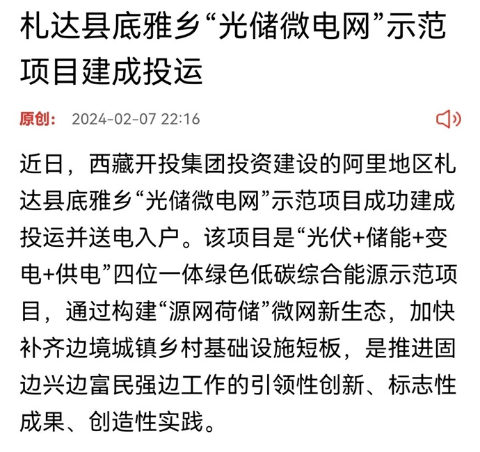 編者按:2月7日,西藏日報發(fā)表《札達縣底雅鄉“光儲微電網(wǎng)”示范項目建成投運》文章。全文如下:
