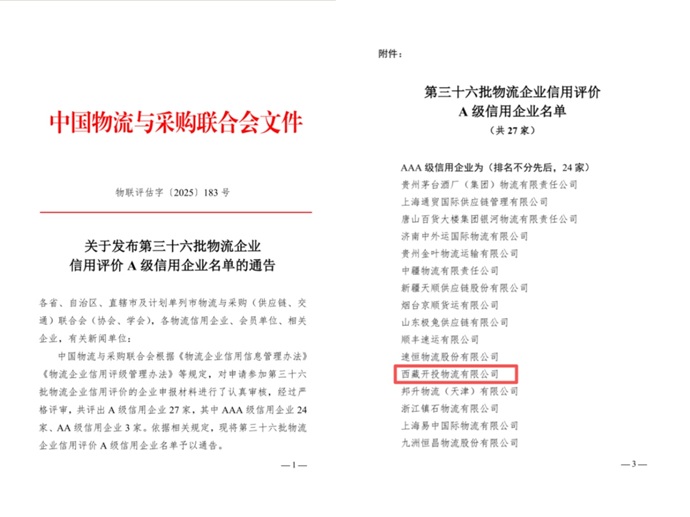 近日,中國物流與采購聯(lián)合會(huì )公布了第三十六批物流企業(yè)信用評價(jià)A級信用企業(yè)名單,西藏開(kāi)投物流有限公司獲評“AAA級信用企業(yè)”。