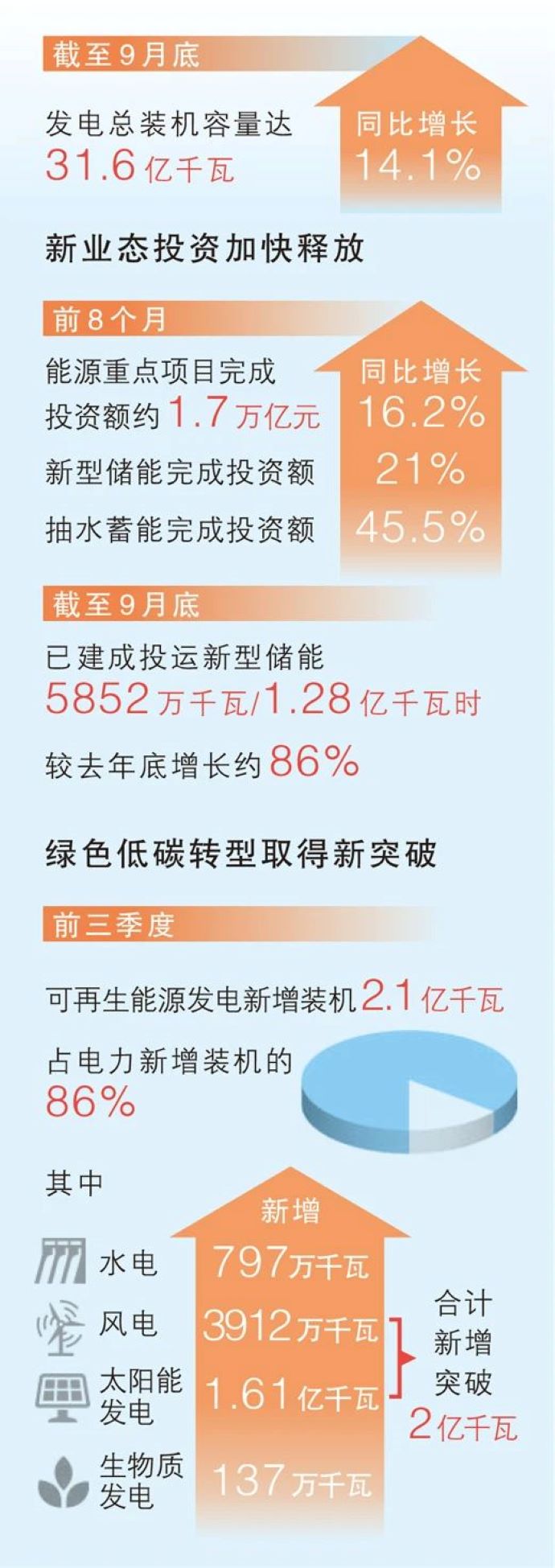 能源新業(yè)態(tài)投資多點(diǎn)開(kāi)花。前8個(gè)月,新型儲能完成投資額同比增長(cháng)21%,抽水蓄能完成投資額同比增長(cháng)45.5%。甘肅、青海、新疆一批多能互補清潔能源基地項目有序推進(jìn),內蒙古在建綠氫制備項目、河南在建加氫設施項目持續形成有效投資。