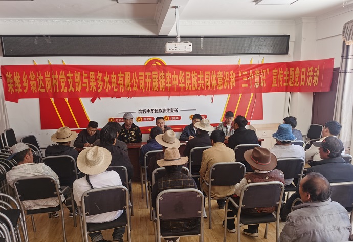 6月25日,果多水電公司黨支部結合習近平新時(shí)代中國特色社會(huì )主義思想主題教育活動(dòng)與柴維鄉翁達崗村黨支部聯(lián)合開(kāi)展了以“鑄牢中華民族共同體意識和‘三個(gè)意識’”為主題的黨日活動(dòng)。
