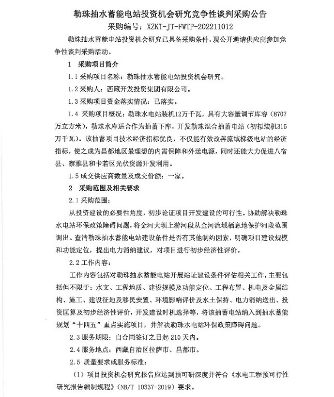 勒珠抽水蓄能電站投資機會(huì )研究競爭性談判采購公告