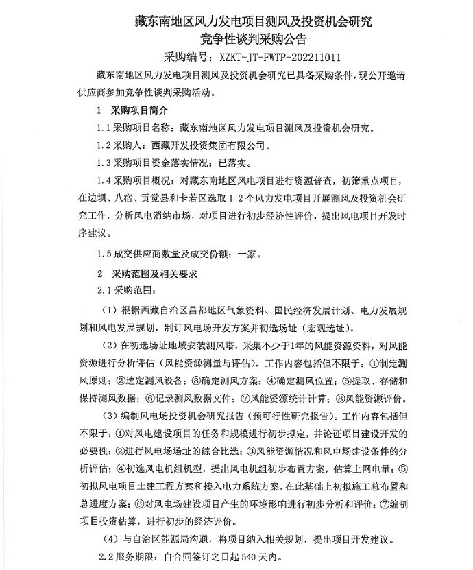 藏東南風(fēng)力發(fā)電項目測風(fēng)和投資機會(huì )研究競爭性談判采購公告