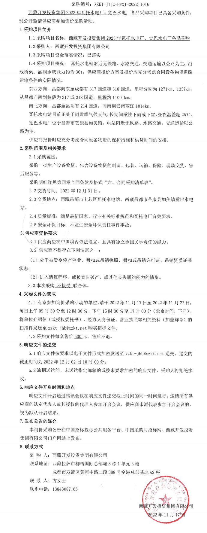 西藏開(kāi)發(fā)投資集團2023年瓦托水電廠(chǎng)、覺(jué)巴電廠(chǎng)備品采購公告