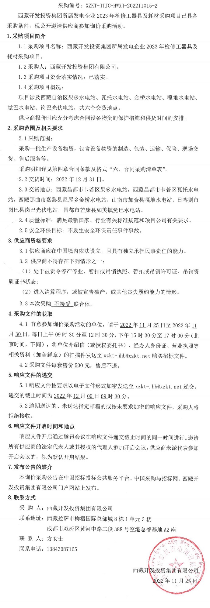 西藏開(kāi)發(fā)投資集團所屬發(fā)電企業(yè)2023年檢修工器具及耗材