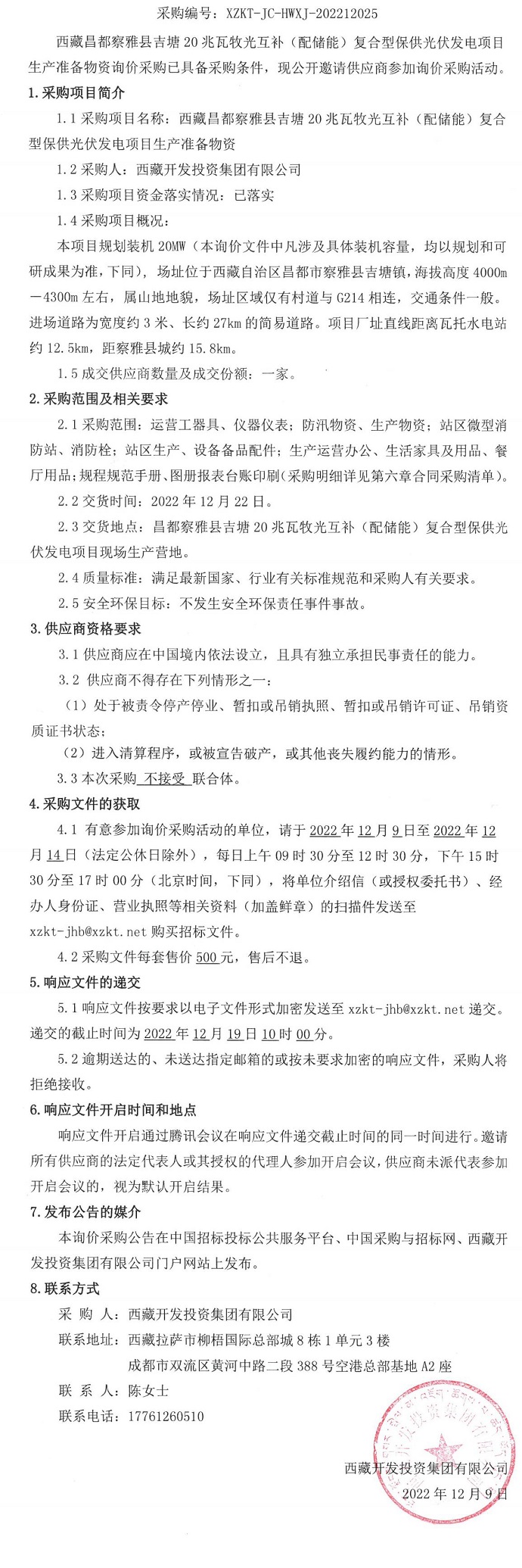 光伏發(fā)電項目生產(chǎn)準備物資詢(xún)價(jià)采購公告