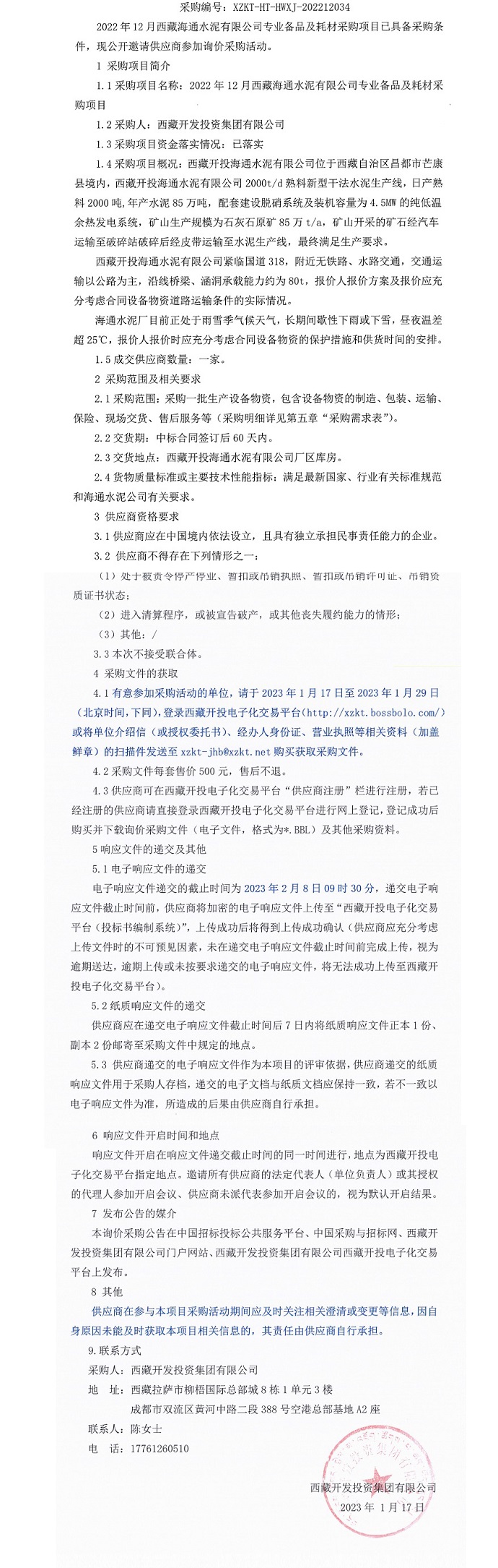 2022年12月西藏海通水泥有限公司專(zhuān)業(yè)備品及耗材采購項目詢(xún)價(jià)就采購公告