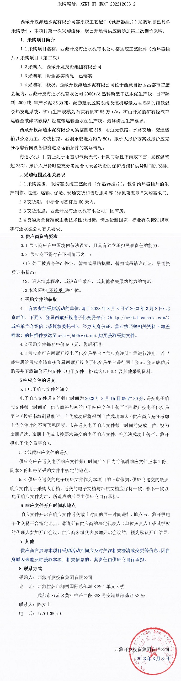 西藏開(kāi)投海通水泥有限公司窯系統工藝配件(預熱器掛片)采購項目(第二次)詢(xún)價(jià)采購公告