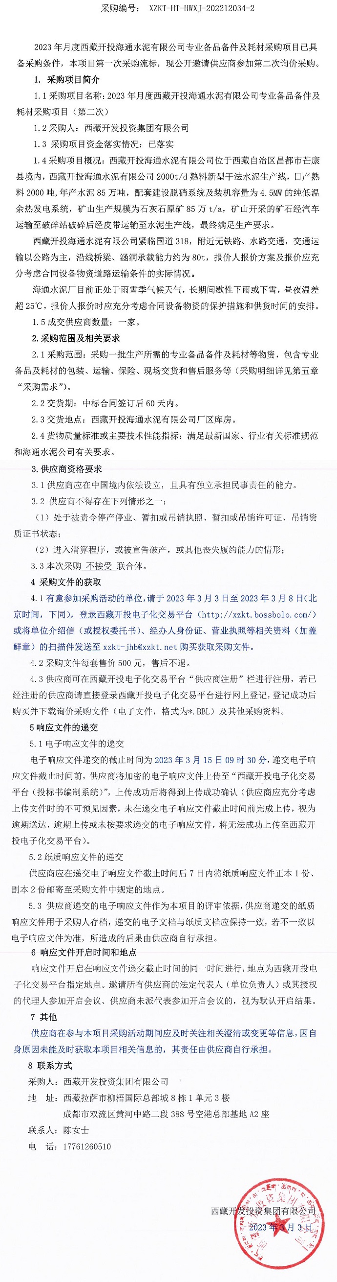 2023年月度西藏開(kāi)投海通水泥有限公司專(zhuān)業(yè)備品備件及耗材采購項目詢(xún)價(jià)采購公告