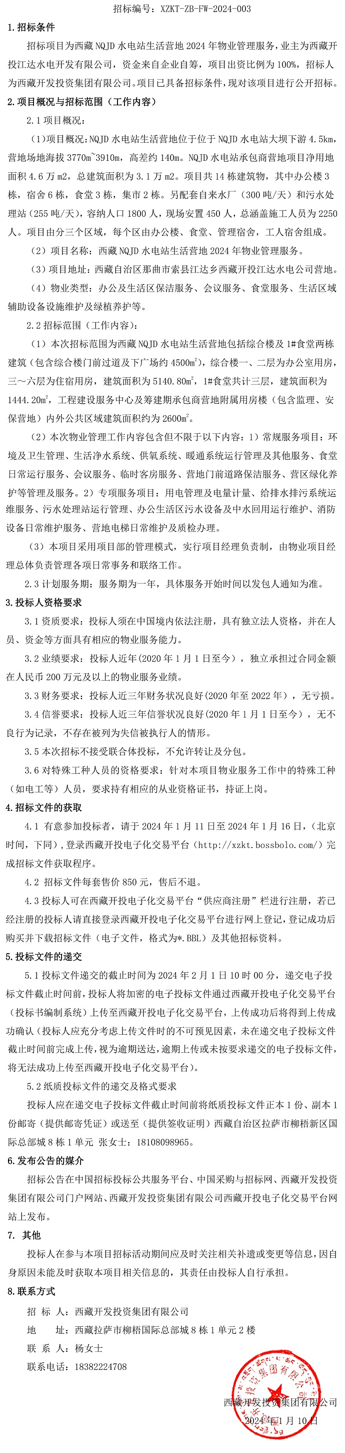 西藏 NQJD 水電站生活營(yíng)地 2024 年物業(yè)管理服務(wù)招標公告