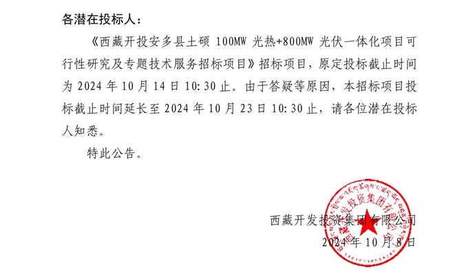 關(guān)于延長(cháng)《西藏開(kāi)投安多縣土碩100MW光熱+800MW光伏一體化項目可行性研究及專(zhuān)題技術(shù)服務(wù)招標項目》投標截止時(shí)間的公告