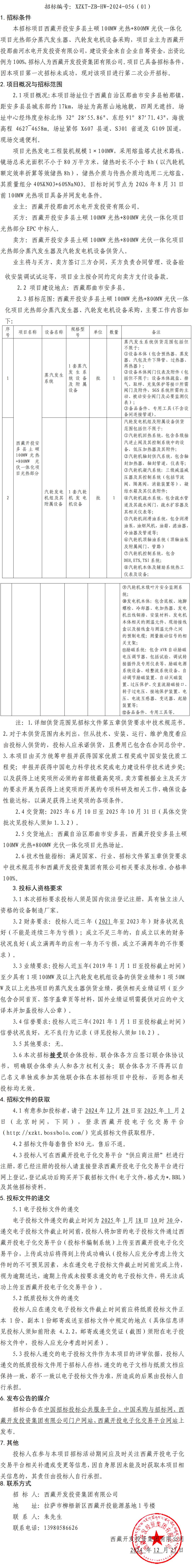 西藏開(kāi)投安多縣土碩 100MW 光熱+800MW 光伏一體化項目光熱部分蒸汽發(fā)生器、汽輪發(fā)電機設備采購招標(第二次)公告