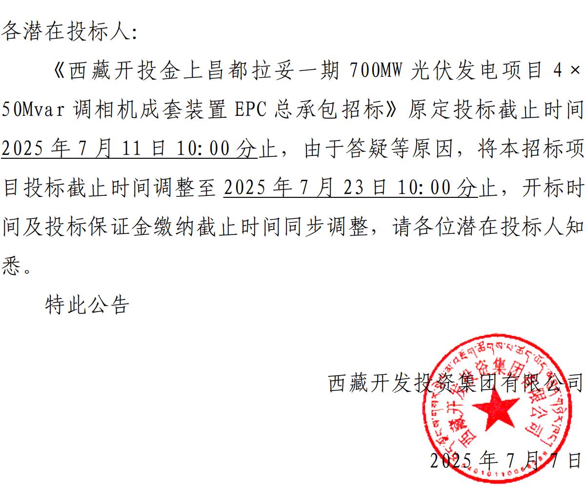 關(guān)于延長(cháng)《西藏開(kāi)投金上昌都拉妥一期700MW光伏發(fā)電項目4×50Mvar調相機成套裝置EPC總承包招標》投標截止時(shí)間的公告