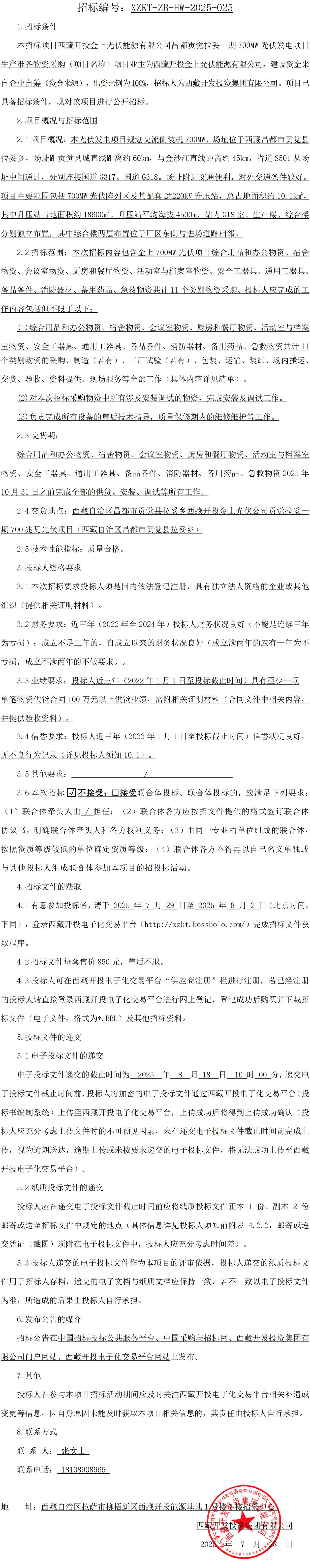 西藏開(kāi)投金上光伏能源有限公司昌都貢覺(jué)拉妥一期700MW光伏發(fā)電項目生產(chǎn)準備物資采購招標公告