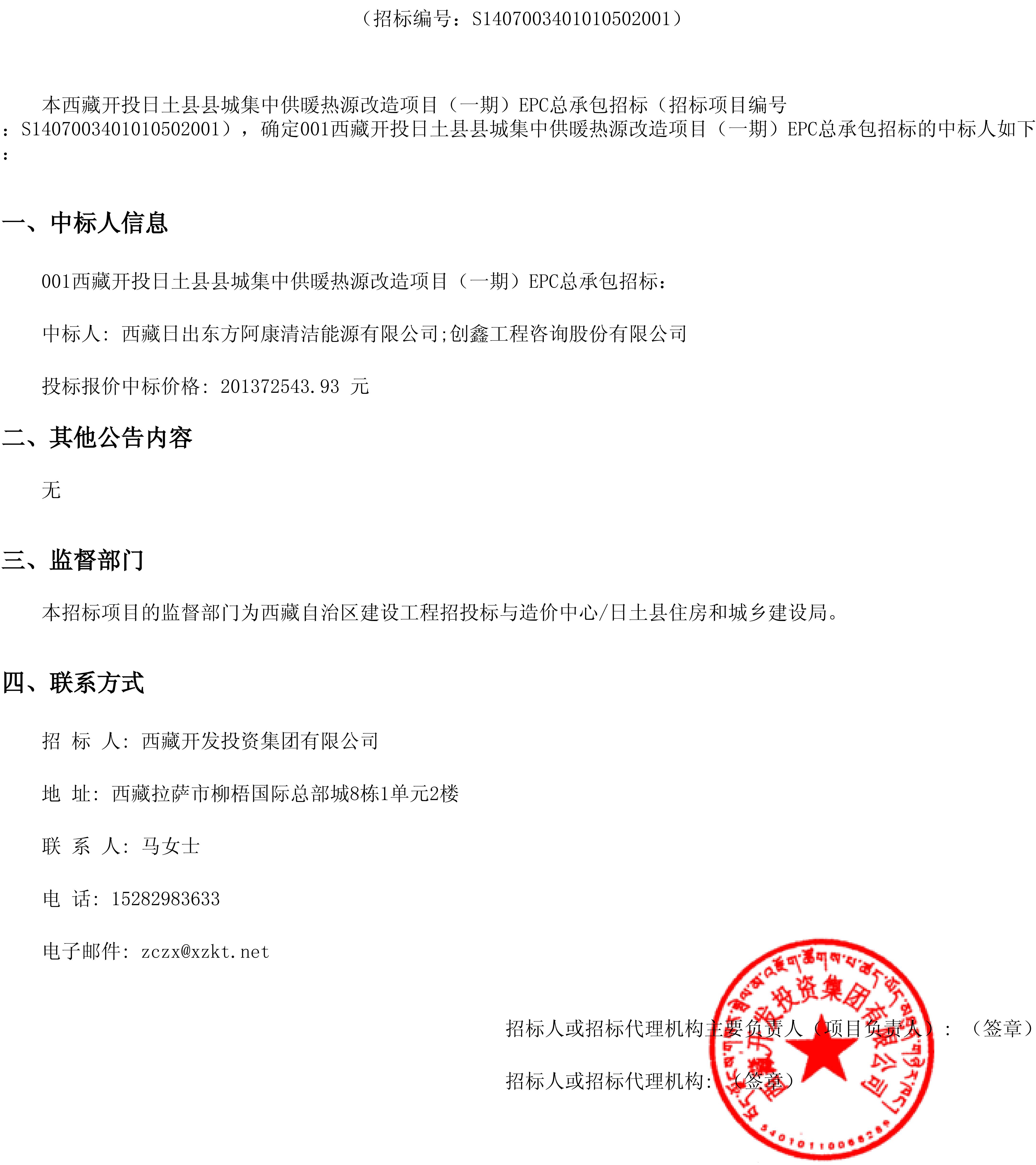 西藏開(kāi)投日土縣縣城集中供暖熱源改造項目(一期)EPC總承包招標項目中標結果公告